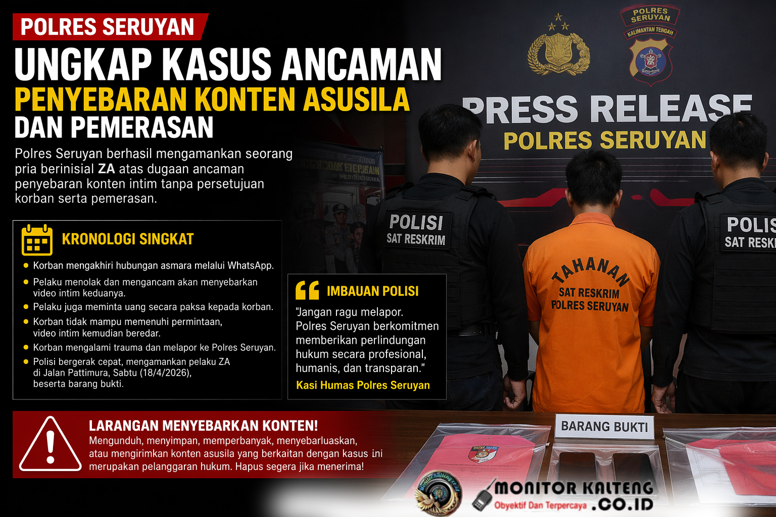 MONITOR KALTENG, SERUYAN, — Kepolisian Resor (Polres) Seruyan mengungkap kasus dugaan ancaman penyebaran konten intim tanpa persetujuan serta pemerasan yang menimpa seorang perempuan di wilayah Kabupaten Seruyan, Kalimantan Tengah. Seorang pria berinisial ZA telah diamankan dan kini menjalani proses hukum.