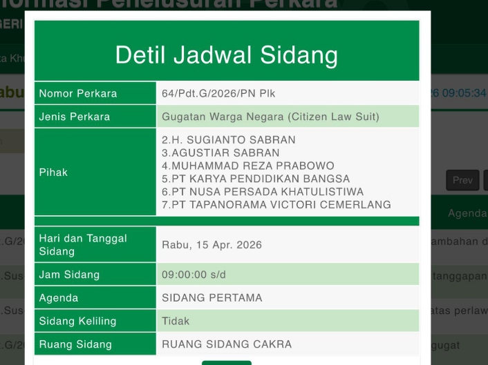MONITOR KALTENG, Palangka Raya – Sidang perdana perkara gugatan warga negara (citizen lawsuit) dengan nomor 64/Pdt.G/2026/PN Plk akan digelar pada Rabu, 15 April 2026 di Pengadilan Negeri Palangka Raya.