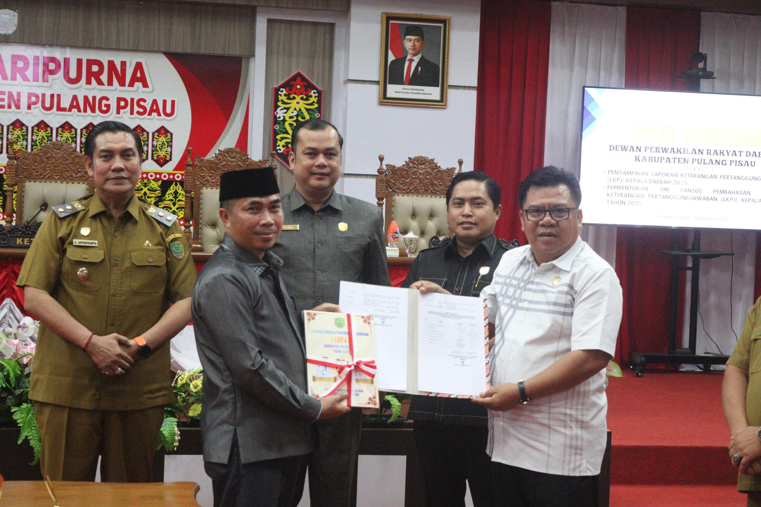 Pulang Pisau-Monitorkalteng.co.id/Ketua DPRD Tandean Indra Bela, memimpin Rapat Paripurna DPRD dalam agenda penyampaian Laporan Keterangan Pertanggungjawaban (LKPJ) Kepala Daerah Tahun Anggaran 2025 sekaligus pembentukan Panitia Khusus (Pansus)Rapat yang berlangsung di Ruang Rapat Paripurna DPRD kabupaten pulang pisau,kalimantan tengah,30/03/2026)