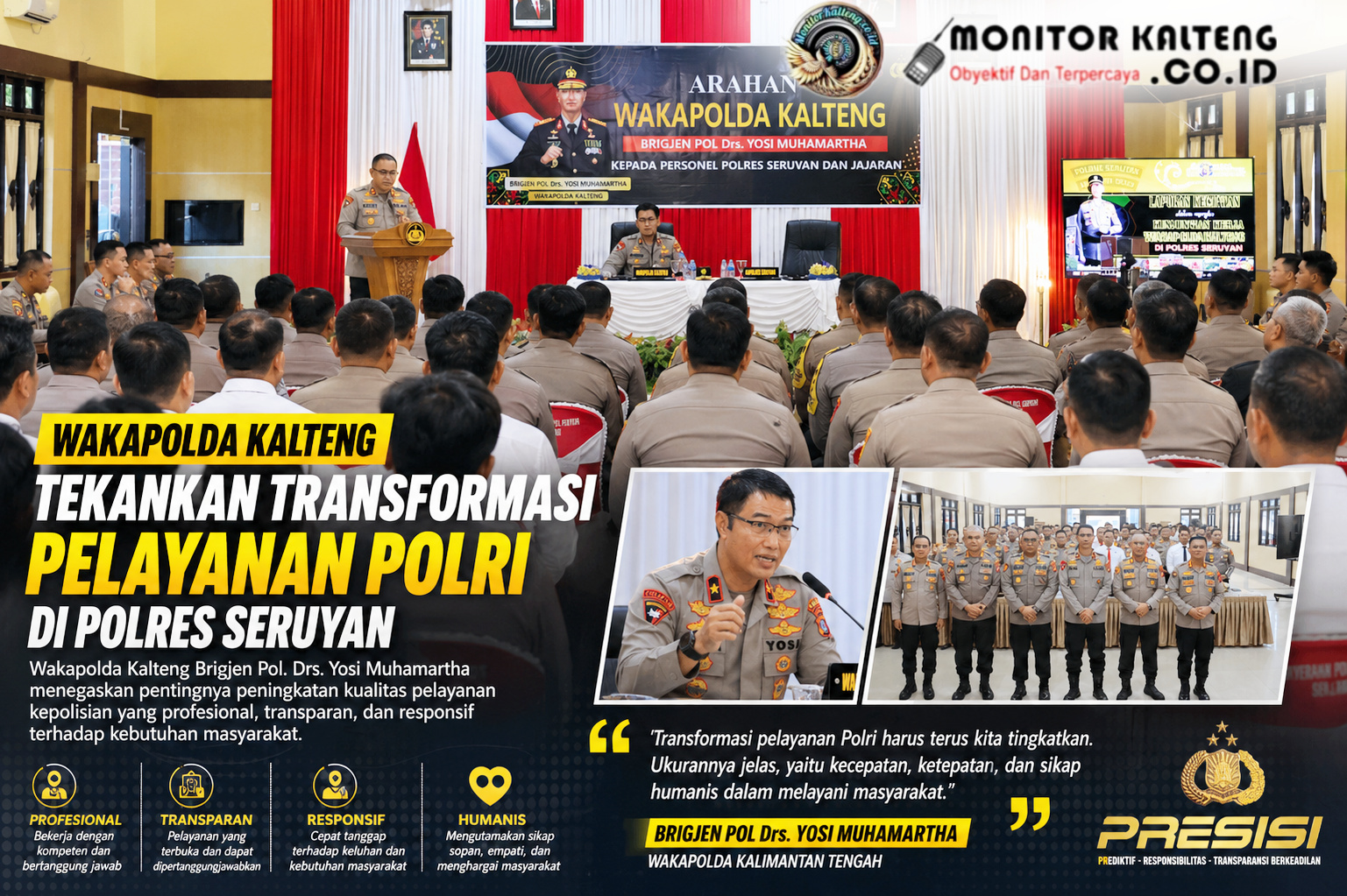 MONITOR KALTENG, SERUYAN, — Wakil Kepala Kepolisian Daerah Kalimantan Tengah, Brigjen Pol. Drs. Yosi Muhamarta, menegaskan pentingnya percepatan transformasi pelayanan publik di tubuh Polri saat memberikan arahan kepada jajaran Polres Seruyan, Senin (27/4) sore.